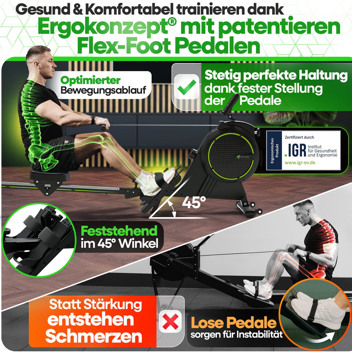 Wir gehen Probleme an! Durch die im 45 feststehenden Flex-Foot-Pedale wird eine ergonomisch perfekte Fußstellung gewährleistet! Gleichzeitig lässt sich die Ferse beim Trainieren anheben, sodass es zu keiner Überdehnung im Fußgelenk kommt!